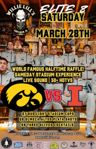 Willie Lill’s is bringing the full game day setup for Iowa vs. Illinois on Saturday, March 28th. Expect a lively crowd, tournament-level intensity, great drink specials, and a watch party atmosphere that makes every possession feel like the biggest one of the night.