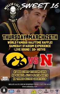 Catch all the Sweet 16 action at Willie Lill’s as Iowa takes on Nebraska on Thursday, March 26th. With live sound, 30+ HDTVs, and a high-energy game day atmosphere, Willie Lill’s is ready for a big tournament night.